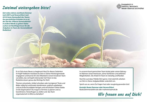 Aus persönlichen Gründen ist es an der Zeit die »Pflanze Gemeindebrief« in andere Hände zu geben! Daher