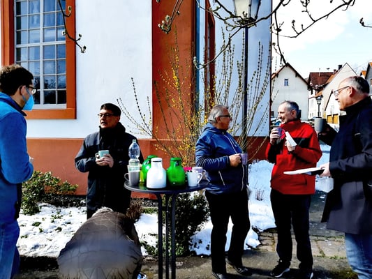 Nachfolgend einige Impressionen vom Gottesdienst (Ausrichten des Beamers, die letzten Millimeter, Videoübertragung ins Gemeindehaus, das Herz haben die Kinder mit dem KiGo-Team gebastelt, Kirche im Januar - Spaß, war natürlich heute, Kirchenkaffee mit Kaffee, Tee und Brot, im Schnee)