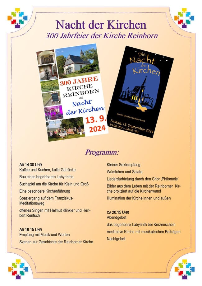 2024-09-05: Reinborn (me): Nicht nur in Heftrich, sondern auch in Reiborn wird die Nacht der Kirchen begangen. Ein Besonderheit ist die Verbindung mit der 300-Jahr-Feier der Kirche. Daher bgeinnt die Nacht der Kirchen bereits am Nachmittag: