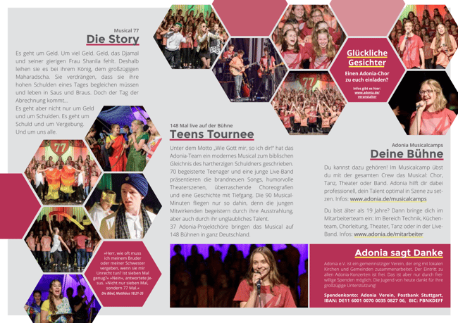 Unter dem Motto „Wie Gott mir, so ich dir!“ hat das Adonia-Team ein modernes Musical zum biblischen Gleichnis des hartherzigen Schuldners geschrieben.